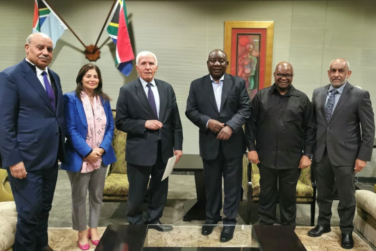استقبل رئيس جمهورية جنوب إفريقيا سيريل رامافوزا، اليوم الجمعة، عضو اللجنتين التنفيذية لمنظمة التحرير الفلسطينية والمركزية لحركة "فتح" عزام الأحمد والوفد المرافق له، على هامش أعمال مؤتمر مجموعة "بريكس" في العاصمة الجنوب إفريقية بريتوريا.