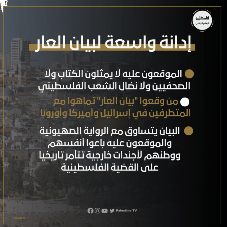 إدانة واسعة لبيان العار: الموقعون عليه لا يمثلون الكتاب ولا الصحفيين ولا نضال الشعب الفلسطيني