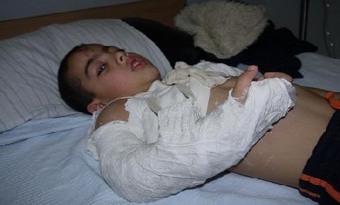 كان يصرخ من شدة الألم في يده المكسورة، والدموع تنزف من عينيه، فيما والدته تشاركه البكاء: "يا حبيبي يا ابني"، والألم يعتصرها على فلذة كبدها، والوالد والأقارب يحاولون شد أزره: "ما تعيط أنت بطل". إثر كشف الأطباء عن حالته الصحية. وكان الجبس يلتف حول يده اليمنى، فيما تحتل إبرة الكيلو يده اليسرى، والرضوض واضحة على قدميه ورأسه.
