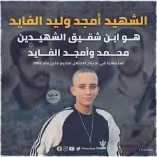 وفي شهر أيار من العام الماضي استشهد أمجد الفايد 20 عاماً برصاص قناص إسرائيلي قرب دوار الأحمدين في مدينة جنين، يقول عمه خالد" فقدنا أمجد في البداية، وعادت ذكرى الفقد في العائلة، كان سيصبح خليفة عمه، وحامل اسمه، لكنه رحل أيضاً، وجربنا ألم الفقد مرة أخرى".