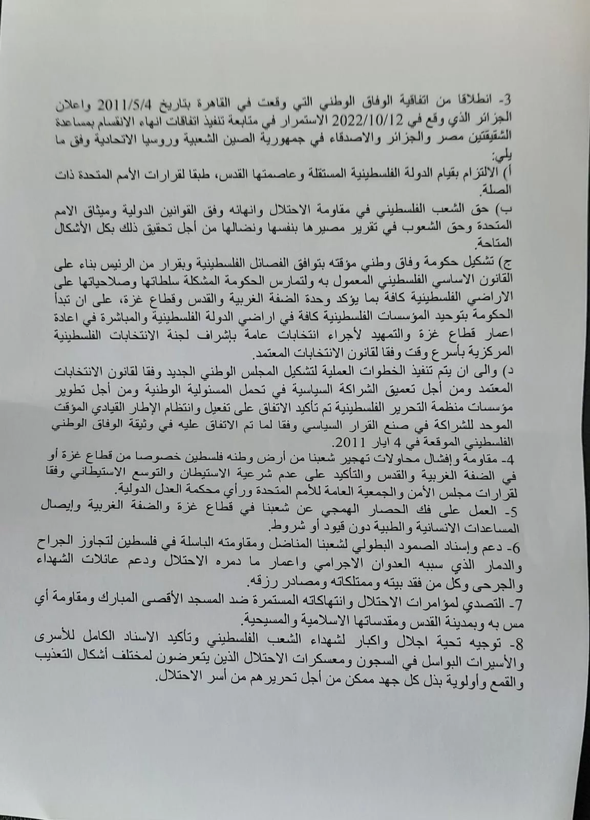 والعنوان الإسرائيلي وانهاء الانقسام بما يحقق طموحات الشعب الفلسطيني في الوحدة الوطنية والحرية والاستقلال الوطني.