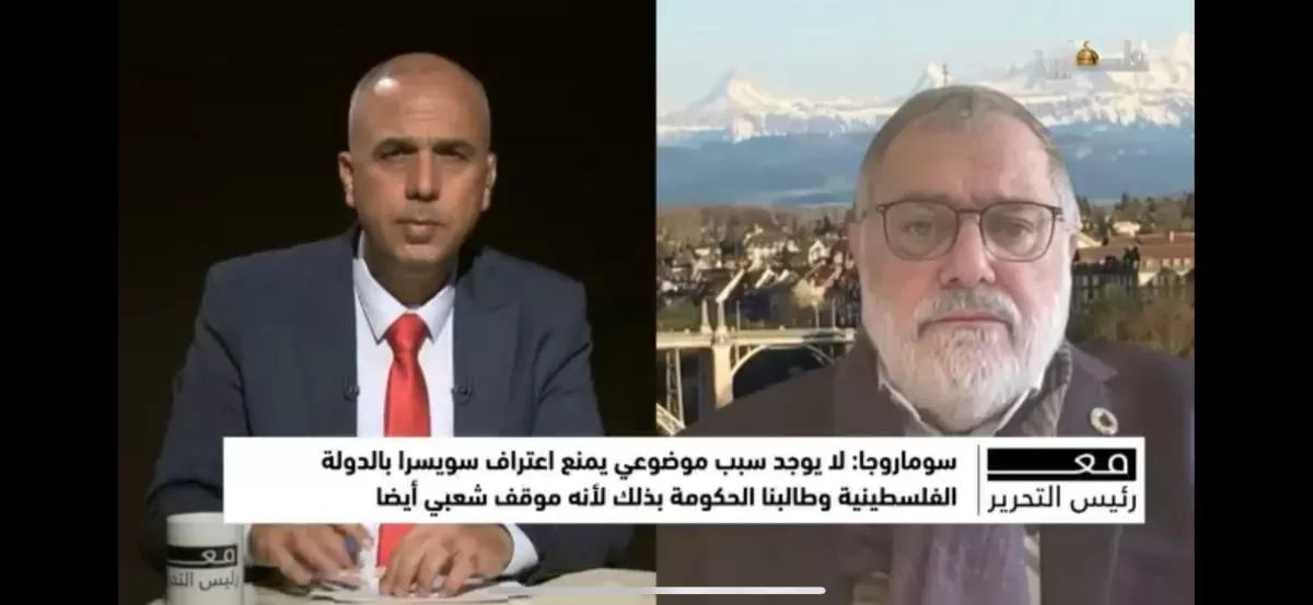 وأكد ضرورة انسجام النظام السياسي في سويسرا مع موقف شعبها، مشيرًا إلى أنه لا يوجد سبب موضوعي يمنع اعتراف سويسرا بالدولة الفلسطينية، وأن هذا الموقف يحظى بدعم شعبي كبير.