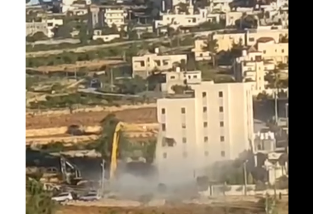 في ذات السياق شرعت جرافات الاحتلال الإسرائيلي، منذ صباح اليوم الاثنين، بهدم عمارة سكنية، مكونة من سبعة طوابق قيد الانشاء، في بلدة بيت أمر، شمال الخليل.