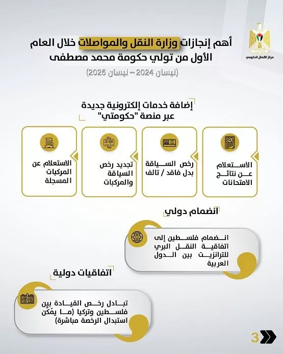 أصدر مركز الاتصال الحكومي، اليوم الاثنين، تقريرًا يُلخّص أبرز إنجازات وزارة النقل والمواصلات خلال العام الأول من تولّي حكومة محمد مصطفى (نيسان 2024-نيسان 2025)، كاشفًا عن سلسلة من التدخلات والإصلاحات التي نفذتها الوزارة على مستوى الضفة الغربية وقطاع غزة، في سياق تعزيز البنية التحتية للنقل، وتسهيل الخدمات، ودعم صمود المواطنين في المناطق المهددة.