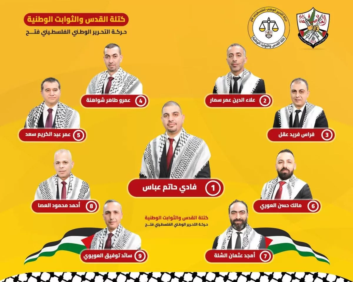فازت قائمة حركة التحرير الوطني الفلسطيني "فتح" في انتخابات مجلس نقابة المحامين الفلسطينيين للدورة الانتخابية (2025- 2028)، والتي جرت يوم أمس، وحصلت على 8 مقاعد من أصل 9، بعد فرز الأصوات، والتي انتهت في ساعة مبكرة من صباح اليوم الأحد.