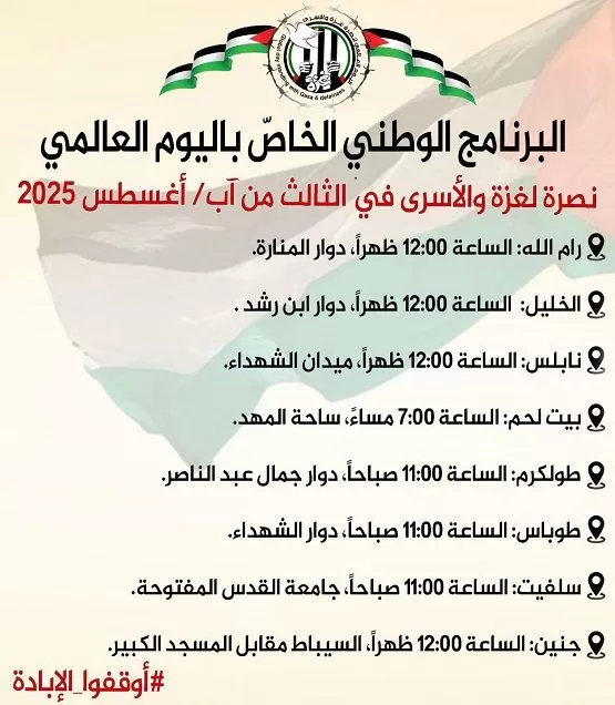 هذا وأعلنت هيئة شؤون الأسرى والمحررين ونادي الأسير الفلسطيني، برنامج الفعاليات في محافظات الضفة الغربية وفق الجدول التالي: