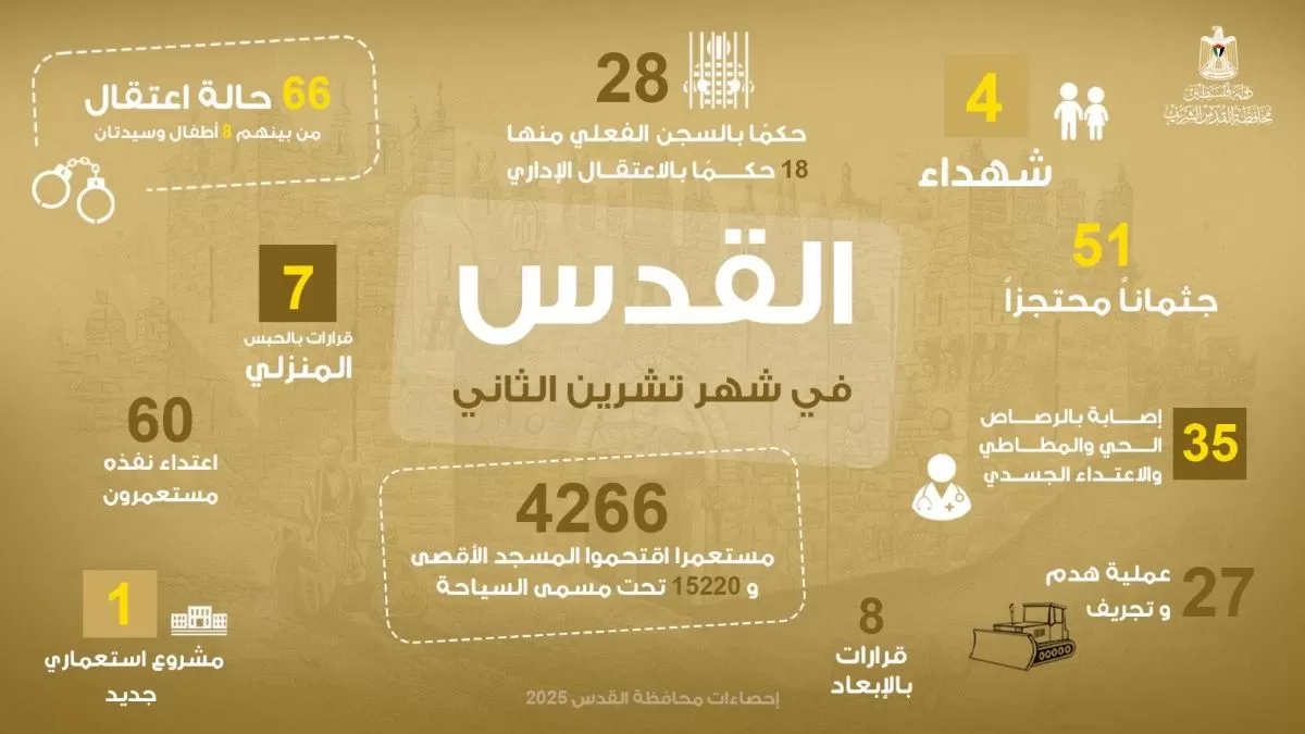وشهدت محافظة القدس المحتلة خلال شهر تشرين الثاني/نوفمبر 2025، تصعيدًا ممنهجًا في الاعتداءات الإسرائيلية التي طالت المؤسسات الدينية، والثقافية، والإعلامية، والاجتماعية، إلى جانب ملاحقة القيادات الوطنية والدينية، في إطار سياسة تهدف إلى إحكام السيطرة على المشهد المدني والروحي في المدينة وتقويض حضورها الفلسطيني.
