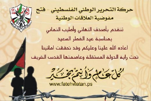 ولهذا نقول اهلا بالعيد وبهجته، اهلا بفرحته تتفتح وردة بعطر الامل، واهلا بالناس اجمعين في بلادنا وبلاد العرب والمسلمين كي ينظموا الى هذه الرؤية وهذا التطلع، ونقول لأهلنا ، احبتنا ، ابناء شعبنا اينما كانوا ، كل عام وانتم بالف خير ، نقول لأسرانا البواسل لكم عيدكم، عيدنا الذي يسأتي قريبا بالفرج وكمال الحرية، ونقول لحاملي الشعلة من قيادتنا ومناضلي حركتنا ولكل مناضلي شعبنا، معكم سنواصل المسيرة وكل عام وانتم والمسيرة بالف خير ، ونقول لأمتنا العربية وشعوب عالمنا الاسلامي : عيد فطر سعيد من اجل نهوض اسعد ، بصواب الربيع اذا ما اصاب الحق في ملاحقة الخذلان والهزيمة والتبعية، لحضور بهي بين الامم وسيادة حقة تعيد لمعاني العروبة روحها في التألف والتضامن والوحدة .