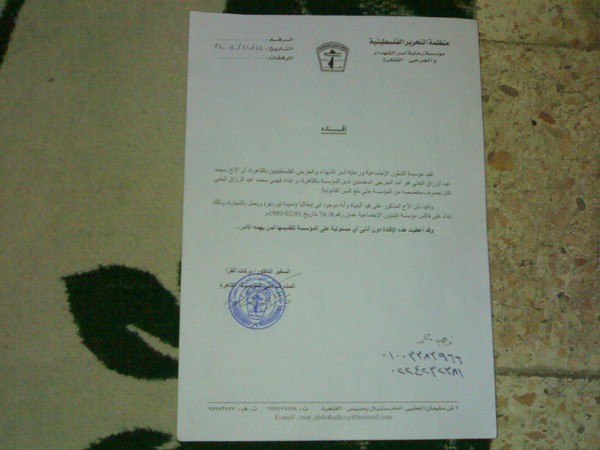 للمزيد من الاستفسار والمعلومات faHmikHiNNA@yahoo.com الموضوع أنا سيدة كانت مقيمة في بيروت الكائن بمحلة الفاكهاني أنا وأمي مصرية الجنسية وتعرفت على زوجي فلسطيني الجنسية محمد عبد الرزاق الخنى ولقبة أبو رعد الكردي وأنجبت منة ولدين الأول بسام والثاني فهمي وعندما أصيبت أنا وزوجي عقب اجتياح إسرائيل للبنان سنة 1982 سافرة إلى يوغسلافيا للعلاج أما زوجي فسافر إلى ايطاليا هو وأبنى بسام أما فهمي فسافر مع والدتي بعد مجزرة صبرا وشاتيلا إلى مصر ثم سافرت من يوغسلافيا إلى مصر وعندما أخبرتني أحدى صديقاتي في مصر أنهما في سوريا ذهبت ومعي فهمي وراءيتهما في مخيم اليرموك بسوريا قال لي زوجي أنهما مسافرين إلى ايطاليا لاستكمال العلاج مرة ثانية سنة 1984 منذ ذالك التاريخ لم أرى أبنى بسام ثم بحثت عنهم دون جدوى ولا أعلم عنهم شيئا ثم علمت بأن الجريح محمد عبد الرزاق الخنى وبعد سؤال المؤسسة دمشق تبين أن الأخ المذكور يعمل بالتجارة ومتزوج من ايطالية وموجود في ايطاليا مع ابنه وبمدينة تورنتو وهو على قيد الحياة حركة التحرير الوطني الفلسطيني (فتح) وارد رقم الشئون/ عمان التاريخ 7/2/1993 ولم يخبروني على عنوانهم بناء على رغبة زوجي هناك علما بأن أطرقت كل الأبواب منذ سنوات وها أنا أدق ببابكم يا سيادة الرئيس مع علمي المسبق بأنكم آهل لذلك ولا تردون محتاج إلا وساعدتموه فكلي أمل بمساعدتي وأدامكم الله ذخرا لنا وللقضية .... ناشر المناشدة شاهيناز البلبيسي .... وأتمنى من كل من تصل له مناشدتي هذه عبر مواقع التواصل الاجتماعي مساعدتي بإيصال صوتي لفخامة الرئيس أبو مازن ولكم الشكر.