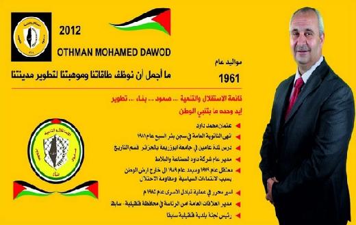 من جانبه اعرب عثمان داود عن فخرة الكبير بالثقة العالية التي نالها من ابناء مدينة قلقيلية عامة وابناء حركة فتح بشكل خاص واعدا ان يكون عند حسن ظن الجميع وان يقوم بخدمة ابناء المدينة وان يعمل على تطبيق ما جاء في البرنامج الانتخابي على اكمل وجه.