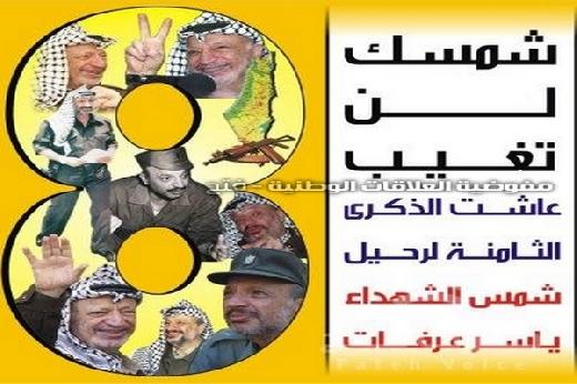 يصادف غدا الأحد الذكرى السنوية الثامنة على رحيل ياسر عرفات "أبو عمار"، قائد الشعب الفلسطيني ومفجر ثورته الحديثة، وأحد أبرز القادة العظام في العالم خلال القرن العشرين.
