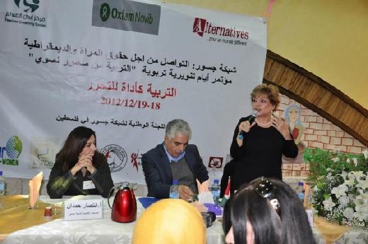بدورها تحدثت انتصار الوزير (أم جهاد) باسم الاتحاد العام للمرأة الفلسطينية كشريك رئيسي في شبكة جسور وتوقفت عند المرحلة السياسية الراهنة التي يعيشها الشعب الفلسطيني ودور المرأة في النضال الوطني الفلسطيني من جهة وكذلك دورها في العملية التربوية في الأسرة والمدرسة والمجتمع وبعد استعراضها للمخاطر التي تواجه المرأة الفلسطينية توقفت عند المؤتمر النسوي العربي الذي أكدت على الحق في المشاركة وصناعة القرار وفي التربية والتعليم والصحة والثقافة ,كما أشارت للدور الذي تضطلع به وزراه التربية والتعليم في النهوض بالفتاة الفلسطينية أو في ما يتصل بدور المرأة في العملية التربوية برمتها.