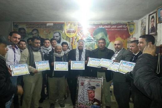 وفيما يلي ننشر لكم أسماء الإخوة المناضلين الذين تسلموا شهادات التقدير: 1- الأخ المناضل: عبد الهادي أبو عمره - أمين السر 2- الأخ المناضل: عماد شبلاق - مفوض اللجنة الاعلامية 3- الأخ المناضل: صالح حسونه - مفوض العمل التنظيمي 4- الأخ المناضل: فضل زعرب - مفوض العمل الاجتماعي 5- الأخ المناضل: هيثم السويركي - مفوض الأشبال والزهرات 6- الأخ المناضل: أسامة الصفدي - مفوض ملف الانتخابات 7- الأخت المناضلة: ناريمان عريقات - مفوض ملف المرأة 8- الإخوة المناضلون: قيادة إقليم غرب غزة 9- مختار عشيرة الوحيدات: الحاج، أبو إياد الوحيدي، تكريماً له ولجهوده الداعمة لقيادة المنطقة وبدوره وصف المكتب الإعلامي لكتائب شهداء الأقصى (لــواء غــزة)هذه الزيارة وما سبقها من الفعاليات، التي نظمتها الكتائب، بأنها تندرج ضمن حملة التواصل الإجتماعي التي أطلقتها كتائب شهداء الأقصى، دعماً لحركة فتح ممثلة بقائدها العام السيد الرئيس، محمود عباس، سعياً منها للمساهمة في توطيد وتمتين علاقة حركة فتــح بالشارع الفلسطيني، وبالقاعدة التنظيمية الفتحاوية.