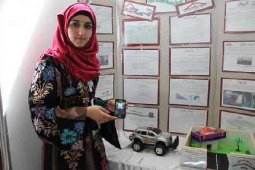 الطالبة آلاء قبيطة تعرض جهاز انذار الحوادث الذي صممته