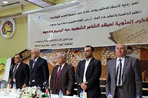 وقال رئيس جامعة القدس المفتوحة يونس عمرو إن "الجامعة تأبى إلا أن تكون حاملة راية شعبنا في ميادين التعليم والنضال"، معتبرا أن "محمود رمز من رموز نضال شعبنا، الذي عز نظيره في أيامنا الحاضرة، فهو شاعر قال قولا وصدقّه، وكل كلمة قالها في شعره كانت حقيقة صدرت عن قلب سليم وعن إرادة فاعلة فطبقها حتى استشهد فكان مثلا لفارس الكلمة والسيف معا".