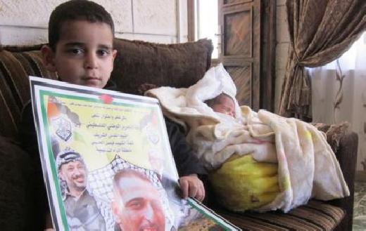ابن الشهيد غزاونة يحمل صورته وفي الخلف المولودة الجديدة ديالا