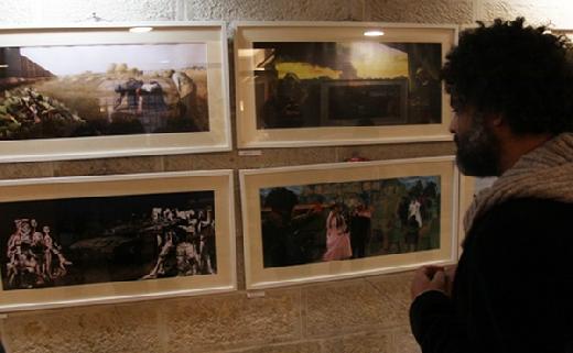 وقدم الحواجري في معرضه الذي أقيم في المركز الثقافي الألماني الفرنسي، مساء اليوم الأربعاء، لوحات فنية دمج فيها صوراً لتظاهرات فلسطينية، ومدنا فلسطينية مقصوفة وطائرات حربية، وعمليات اغتيال لفلسطينيين، وأخرى لجدار الفصل العنصري، مع الشخصيات الأصلية في اللوحات.