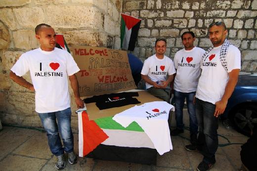 مجموعة شبابية، توزع ملابس على السياح الاجانب كتب عليها "أحبك يا فلسطين". -عدسة:احمد مزهر