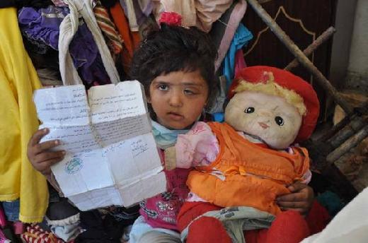 خلال اجراء المقابلة جلست صغيرتها التي تعاني من سرطان في رأسها وعينها وسط كوم من الغسيل المتسخ تلعب بدميتها الممزقة وتنصت لحديث والدتها حتى قاطعتها بالقول: "نفسي أروح المدرسة والبنات ما ينادوني "بالعورة"، متابعة: بدي أحرق حالي عشان أرتاح.