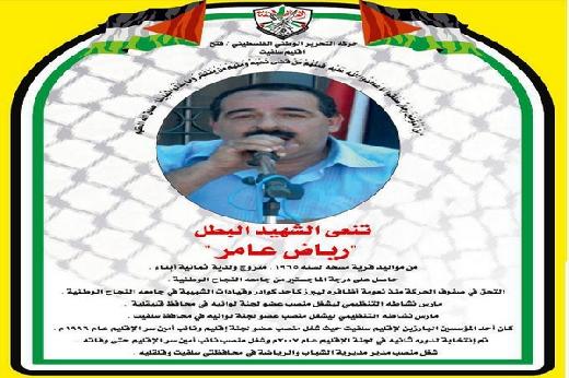 ولد المرحوم رياض عامر في بلدة مسحة التابعة لمحافظة سلفيت العام 1965، وإلتحق بصفوف حركة فتح منذ نعومة أظفاره، وكان من أبرز قيادات الشبيبة الفتحاوية في جامعة النجاح، وحاز على شهادة الماجستير من جامعة النجاح، وشغل موقع عضو لجنة لوائية في محافظة قلقيلية، ثم عضو لجنة لوائية في محافظة سلفيت، وهو من مؤسسي إقليم سلفيت، فقد شغل منصب نائب أمين السر منذ العام 1996، واعيد إنتخابه عضو لجنة تنظيم العام 2008، وهو متزوج وله ثلاثة ابناء.