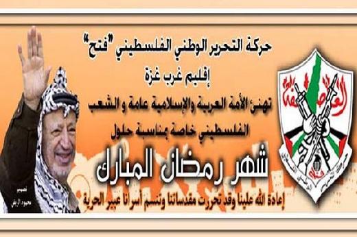 تتقدم حركة التحرير الوطني الفلسطيني" فتح"، إقليم غرب غزة، وجميع المناطق والشعب والكوادر والأعضاء بأحرالتهاني والتبريكات إلي شعبنا الفلسطيني خاصة والشعوب العربية والإسلامية عامة بقدوم شهر رمضان المبارك .. أعاده الله علينا وعلي الأمة العربية والإسلامية وقد تحققت أمانينا بقيام دولتنا الفلسطينية المستقلة وعاصمتها القدس الشريف..