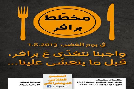 عمّمت المجموعات الشبابيّة الفاعلة في الحراك الشبابي ضدّ مخطّط "برافر" بيانًا حيّت فيه جماهير شعبنا، وجمعيّات ومؤسّسات المُجتمع المدني، والأحزاب والفعاليّات السياسيّة الفاعلة على ما أظهرته من روح وطنيّة ووحدويّة ومسؤوليّة في إنجاح يوم الغضب في الأوّل من آب، والذي اتسم بالسلمية والتنظيم وبحضور شبابي متميز يدل على وعي شعبنا بخطورة المرحلة، مما لم يرق لأجهزة الأمن الإسرائيلية التي بادرت لاستخدام العنف وسياسة الاعتقالات المعتادة لعرقلة نضالنا المشروع.