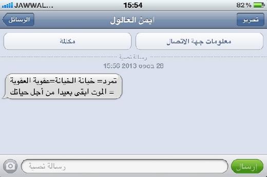 وجاء في نص رسالة التهديد حسب ما تناقلها نشطاء على مواقع التواصل الاجتماعي الفيس بوك " تمرد = الخيانة الخيانة = العقوبة العقوية = الموت.. أبقى بعيدا من اجل حياتك " وحملت الرسالة توقيع باسم " أحمد".