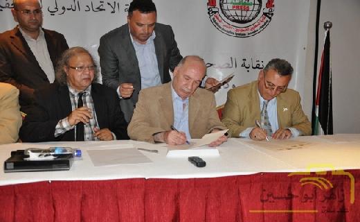 ووقع الاتفاقية عن المؤسسات المملوكة للدولة رئيس مجلس إدارة هيئة الإذاعة والتلفزيون الفلسطيني ووكالة الأنباء والمعلومات الفلسطينية 'وفا'، رياض الحسن، وعن نقابة الصحفيين النقيب عبد الناصر النجار، بحضور ومشاركة الاتحاد الدولي للصحفيين ممثلا برئيسه جيم بوملحة، وذلك في فندق جراند بارك بمدينة رام الله.