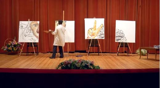 ويظهر مقطع الفيديو الفنان الفلسطيني وهو يرسم صورة ياسر عرفات على أربع لوحات ورقية في عشر دقائق فقط تمكن خلالها من إبهار الجميع ولاقى عمله الفني ترحيب وتصفيق من الحضور.