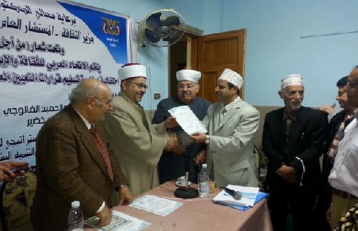 من جانبة قدم القاضي علي بن محسن الاكوع الرئيس العام للاتحاد بأوراق اعتماد فرع الاتحاد بفلسطين في حفل شهده عدد من المثقفين والأدباء والعلماء .أكد فيه على أهمية الاتحاد العربي للثقافة والابداع في التواصل الثقافي والابداعي بين الشعوب العربية والاسلامية وابراز تراثها وثقافتها وأوضح ان الاتحاد منتشر في كل الدول العربية وان افتتاح الفرع في فلسطين يتخذ طابعا خاصا ومهما لما لفلسطين من مكانة تاريخية وثقافية