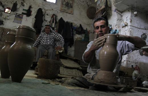 وعلى رفوف بدائية يضع آل الفاخوري نماذج من صناعة الصلصال. وقال، انه' يعمل نحو 10 ساعات يوميا وأحيانا أكثر'.