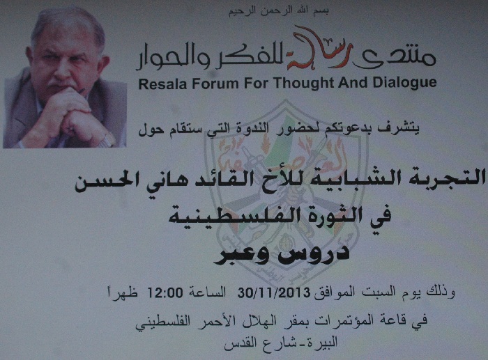 أعلن منتدى "رسالة" للفكر والحوار، عن تنظيمه ندوة بعنوان "التجربة الشبابية للأخ القائد هاني الحسن في الثورة الفلسطينية"، وذلك بعد غد السبت الساعة الثانية عشر ظهراً في قاعة المؤتمرات بمقر الهلال الأحمر الفلسطيني بمدينة البيرة.