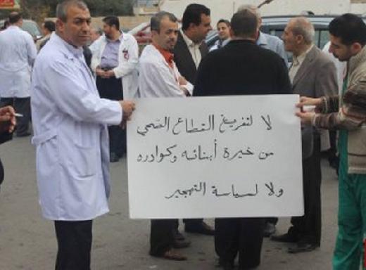 واعتبروا في بيان جرى توزيعه خلال الوقفة أن القرار 'سيؤدي إلى انهيار في مستوى الخدمات الصحية المقدمة لأبناء شعبنا ووقوع المواطن خاصة ذوي الدخل المحدود في براثن الفقر والمرض لعدم إقدام الوزارة على توفير البدائل وخاصة المناطق النائية'. بحسب نص البيان.