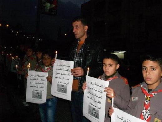 واضاء اطفال الكشافة الشموع، وحملوا اللافتات التي تؤكد تضامن اطفال مخيم بلاطة مع اطفال مخيم اليرموك، وتطالب برفع العدوان عنهم وتوفير الطعام والحماية الدولية لهم.