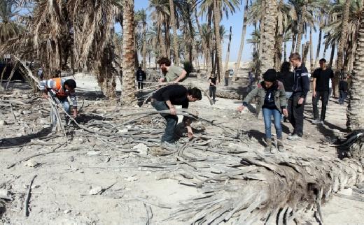 وما أن بدأ اعضاء المجموعة بشرب الشاي المعدِ على النار وتناول خبز الطابون حتى بدأ الحاج "أبو سفيان" (54 عاما) بتقسيم مجموعته إلى عدة عناصر بغية تنظيف القرية من اغصان النخيل التي ملأت المكان.