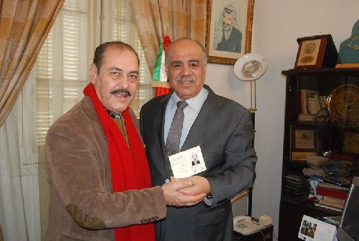 سلم سفير دولة فلسطين لدى تونس سلمان الهرفي، اليوم الجمعة, الفنان العربي التونسي لطفي بوشناق، البطاقة القنصلية بصفته مواطنا فلسطينيا.