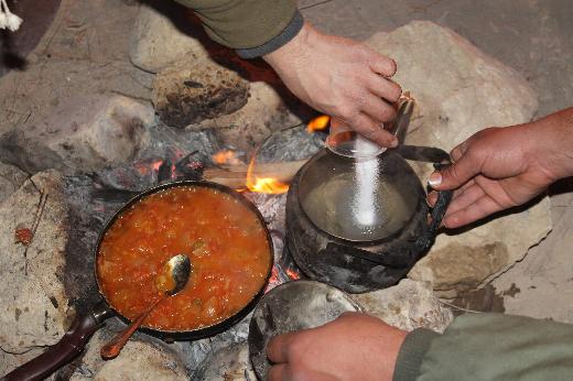 الساعة الآن تقارب على الواحدة صباحا وهنا بدأت انا واصدقائي نشعر بالجوع خاطبتهم وقلت لهم بأنه استحقت الآن "قلاية البندورة" انا ويزن وحمزة ومحمد وأسامة أبو غالي انطلقنا الى موقع تواجدنا على الجهة الغربية وأعددنا موؤدة نار وانا بدأت باعداد قلاية البندورة بجانبها ابريق شاي معتبر وفور اعدادها بدأنا بدعوة من تبقى يقظا من الاخوة في المخيم واذكر هنا بأنه حضر الأخ أبو حسن مطر والأخ عمر شلبي والاخ صلاح الخواجا والاخ جميل البرغوثي وثائر انيس وفادي الشواهين وأبو الخطيب واحمد ادعيس حسن فقوسة وماهر سمارو وبدأنا جميعا في تناول قلاية البندورة التي كانت الأولى في المعسكر .. وهذه الجمعة الطيبة ازالت الكثير من الحواجز بين الاخوة وخصوصا بأننا من مختلف الوان الطيف السياسي الفلسطيني .. وتحقق المثل العربي "لقمة هنية .. بتكفي مية" ..