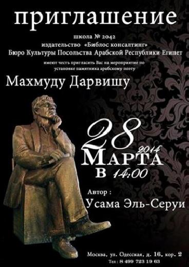 haقال المركز الثقافي الروسي-العربي في سانت بطرسبورغ روسيا، إنه سيتم إزاحة الستار عن النصب التذكاري للشاعر العربي الفلسطيني محمود درويش في باحة إحدى المدارس الحكومية التي تدرس اللغة العربية كلغة أجنبية في موسكو، في ٢٨ آذار الجاري. وأعرب المركز عن شكره للدكتور سليم علي، صاحب دار النشر بيبلوس كونسالتنغ، التي تعنى بنشر وترجمة شيء من الثقافة العربية إلى الروسية، وصاحب ومحقق فكرة تدريس اللغة العربية كمادة أجنبية في بعض المدارس الحكومية في موسكو، والذي كان صاحب فكرة إقامة نصب تذكاري للراحل درويش في باحة إحدى هذه المدارس، وعمل على تحقيقها.