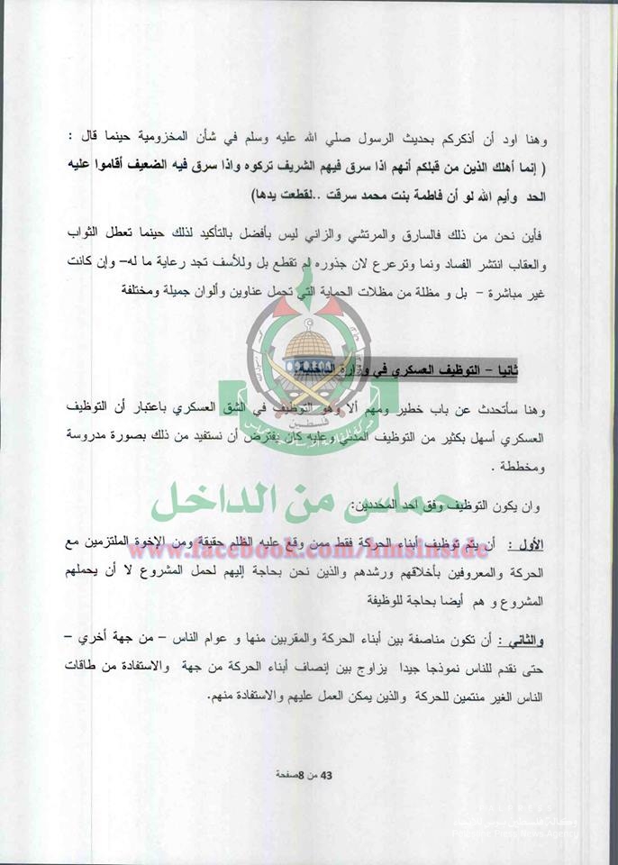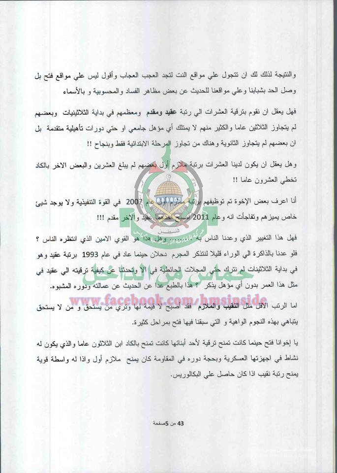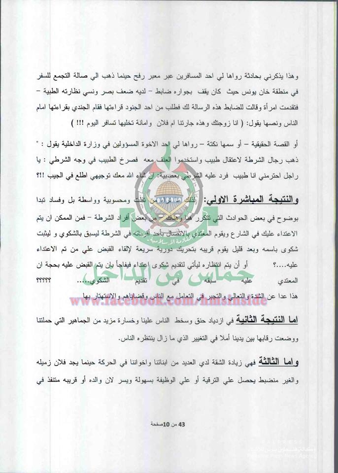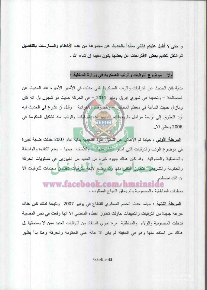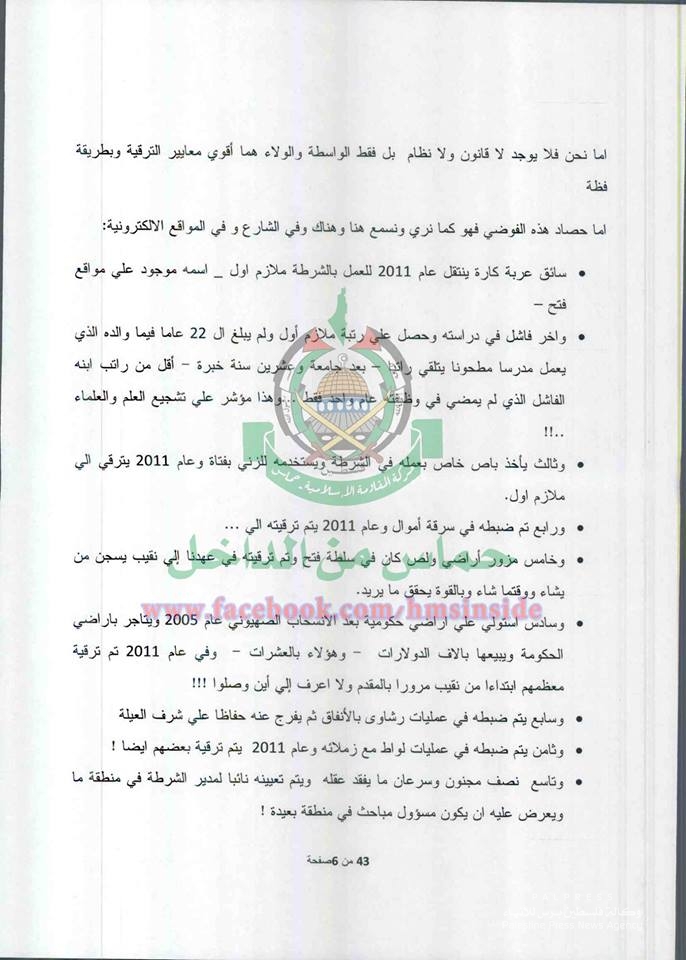 ونشرت الصفحة العديد من الوثائق على تعلقت في الرتب العسكرية والترقيات وآلية التوظيف والمحسوبية في وزارة الداخلية المقالة التي تديرها حماس.