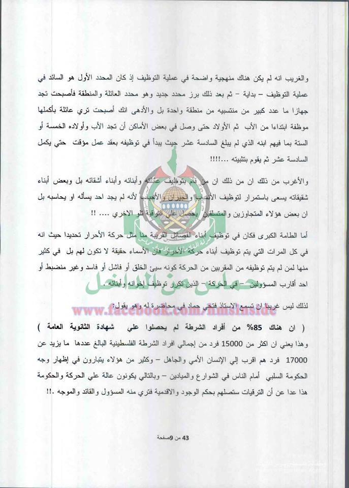 وتكشف تلك الوثائق حجم الفساد والمحسوبية داخل حركة حماس وآلية توظيف عناصرها وأنصارها واستياء الشارع من ممارسات حماس وعناصرها بحقهم.