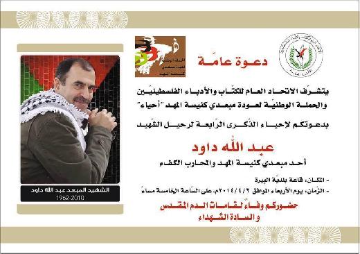 haاعلن اتحاد الكتاب والأدباء الفلسطينيين والحملة الوطنية لعودة مبعدي كنيسة المهد أحياء عن اقامة احياء للذكرى الرابعة لرحيل الشهيد عبد الله داود " ابويوسف " أحد مبعدي كنيسة المهد والمحارب الكفء وذلك في قاعة بلدية البيرة في مدينة رام الله يوم غد الاربعاء 2/4/2014 الساعة الخامسة مساء