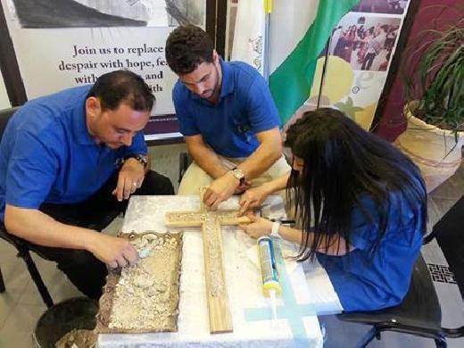 الشاب "انطوني حبش" ومجموعة شبابية من مؤسسة الاراضي المقدسة المسيحية المسكونية يحاولون بمطرقة صغيرة وازميل تكسير اجزاء صغيرة من الجدار الفاصل الذي يحاصر المدينة وإعادة تصنيعها وصبها في قالب على شكل "الصليب المقدس" وتقديمها كهدية لقداسة البابا.