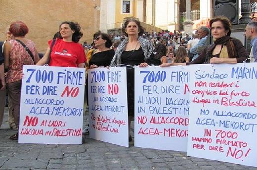 فمنذ اشهر ونشطاء التضامن يقومون بجمع التواقيع من المواطنين المقيمين في روما على عريضة تطالب البلدية ورئيسها ماريني وهيئة المياه في روما بان لا يتواطاوا بسرقة المياه الفلسطينية. وتمكنوا من جمع 7000 توقيع قاموا بتسليمها الى لرئيس مكتب رئيس البلدية.