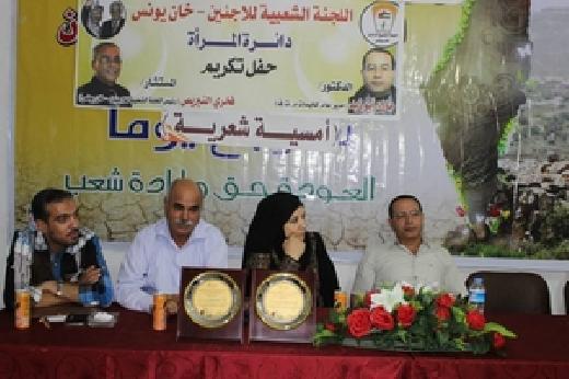 كرمت اللجنة الشعبية للاجئين في محافظة خان يونس ( دائرة المرأة ) الدكتور مازن ابو زيد لتوليه منصب مدير عام المخيمات بدائرة شؤون اللاجئين و المستشار فخري النبريص لتوليه منصب رئيس اللجنة الشعبية للاجئين بحضور عدد من الشخصيات الوطنية و رؤساء لجان الاحياء و الوجهاء و المخاتير و اعضاء دائرة المرأة .