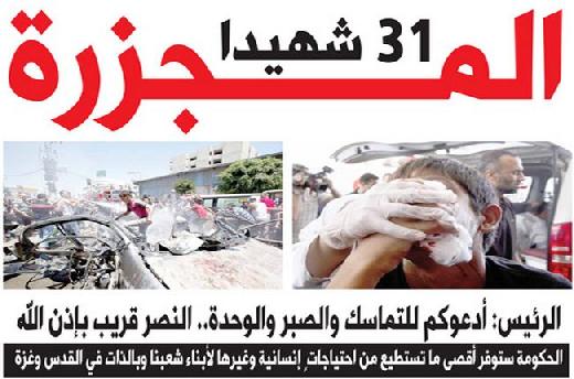 واستشهد ما لا يقل عن 31 مواطنا وأصيب اكثر من 100 آخرين امس في غارات جوية اسرائيلية على قطاع غزة. وقال جيش الاحتلال ان نحو خمسين صاروخا اطلقت من قطاع غزة على اسرائيل منذ منتصف ليلة الاثنين الثلاثاء، في حين قصف الطيران الاسرائيلي "150 موقعا" في القطاع.