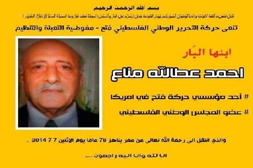 نعت مفوضية التعبئة والتنظيم بحركة التحرير الوطني الفلسطيني 'فتح'، اليوم الخميٍ، ابنها المناضل المرحوم أحمد عطا الله مناع، الذي وافته المنية في الولايات المتحدة الأميركية عن عمر يناهز 78 عاما قضاها في خدمة قضايا أبناء شعبة.