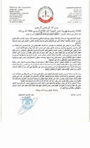 وجاء في مقدمة رسالة نقابة المحامين "نتوجه لفخامتكم بهذه الرسالة وكلنا ثقة ويقين بإيمانكم المطلق ودعمكم أللا محدود للشعب الفلسطيني على مر السنين وقضيته العادلة التي هي قضيتكم والتي حاربتم وقدمتم الغالي والنفيس في سبيل نصرتها ولا زلتم.
