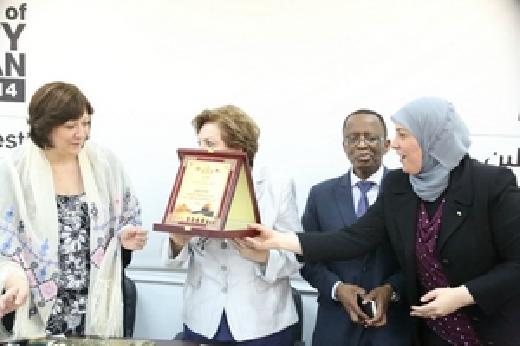 كرّم الإتحاد العام للمرأة الفلسطينية ومحافظ رام الله والبيرة د. ليلى غنام اليوم الممثلة الخاصة لمكتب هيئة الأمم المتحدة للمرأة في فلسطين علياء اليسير، تقديرا لدورها المتميز بدعم المرأة الفلسطينية حيث انتهت مهامها في فلسطين منتقلة لموقع آخر متولية منصباً جديداً في المكتب الإقليمي لأوروبا وآسيا الوسطى، وذلك خلال حفل استقبال أقامه الإتحاد على شرفها بحضور سفير جنوب افريقيا في فلسطين وحشد من القيادات النسوية الفلسطينية الرسمية والشعبية.