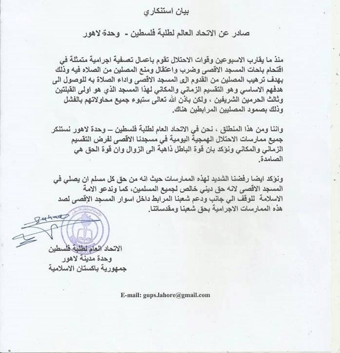 نظم الاتحاد العام لطلبة فلسطين في مدينة لاهور بباكستان وقفة احتجاجية ضد الممارسات الاسرائيلية ضد الشعب الفلسطيني وانتهاك حرمة المقدسات الاسلامية.