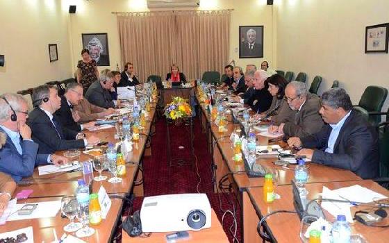 واستمع الوفد إلى عرض من المستشارين في وحدة دعم المفاوضات جميل رباح وعمر الشهابي حول رأي القانون الدولي في الاحتلال وإجراءاته وعلى رأسها الاستيطان والعدوان الأخير على غزة.